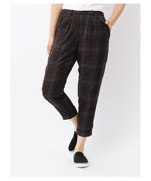 メンズライクな雰囲気が新鮮に映えるタータンチェック柄のパンツです。リラックスしつつ穿けるよう、腰まわりはゆったりと、裾に向かって細くなる形に仕上げました。センタープレス&タック使いで、上品な印象の着こなしに。【モデル身長:約162cm/着用サイズ:Mサイズ】