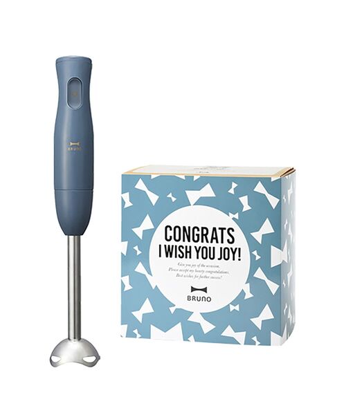 つぶす・混ぜる・刻む・砕く・泡立てるがこれ1 台で!アタッチメントを付け替えて、片手で簡単調理。毎日のお料理からお子様の離乳食づくりまでサポートするマルチスティックブレンダーを、BRUNOオリジナルデザインのメッセージ入りスリーブでラッピングした、お祝いにぴったりのギフトです。 ※ キッチンクロスは、シーズン限定カラー【ブルー】のみ付属いたします。 【商品詳細】 ・機能:ブレンダー(つぶす、混ぜる)、チョッパー(刻む、砕く)、ホイッパー(泡立てる) ・電源:AC100V(ブレンダー・チョッパー使用時 消費電力:200W) ・付属品:ホイッパー、チョッパーボトル、ボトル用フタ、チョッパーボトル専用カッター、ブレンダーカップ(500ml)、お手入れブラシ、専用レシピリーフ ※食器洗い機、食器乾燥機はご使用いただけません。