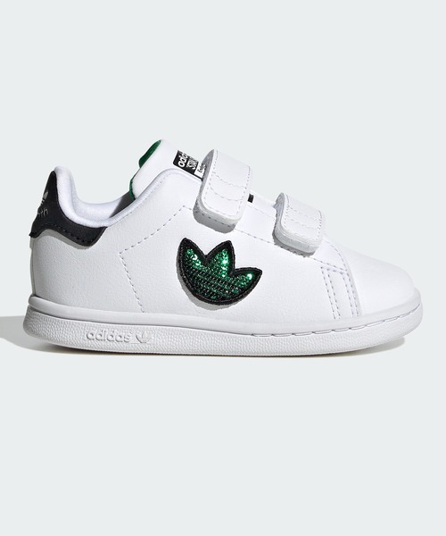 【アディダス公式ショップ】 きらめくスパンコールをあしらった、リサイクル素材のスタンスミス。 元気に遊び回るベビーに似合う、グリーンのキラキラ光るトレフォイルがアクセントの、スタンスミスが誕生。すっきりシンプルな薄底シューズでお馴染みのシルエットは、オリジナルを忠実に再現。唯一違っているのは、片側にあしらった緑のスパンコールで描いたトレフォイル。スタンスミスのシグネチャーであるスリーストライプスのパーフォレーションは、反対側にその姿を残している。 この製品は、アッパーに50%以上のリサイクル素材を使用するなど、プラスチック廃棄物ゼロを目指すアディダスの取り組みの一つをカタチにしたもの。 商品の特徴 ●ラバーアウトソール ●レギュラーフィット ●面ファスナー式ストラップ ●合成皮革アッパー ●アッパーのリサイクル素材含有率は50%以上 ●OrthoLite®ソックライナー ●アディフィット メジャーインソールを搭載 ●ベビーシューズ / トドラー / インファント / キッズシューズ / ファーストシューズ ●商品番号:GY1793 (ホワイト) *サイズによってベルトの数が異なります。 ( 13.0 cmまでは2本 / 13.5 cm以降は3本 )
