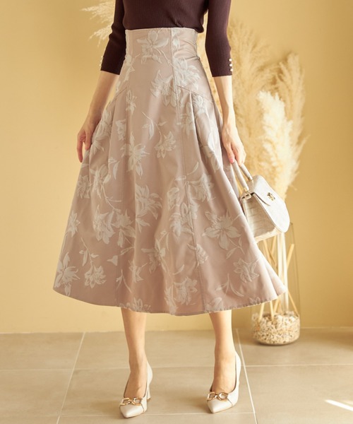 シーズンライクなフロッキー素材の花柄で 秋冬コーデに旬な洒落感をもたらしてくれます♪ サイドにタックを入れた切替デザインでドレープを作り、 エレガントに広がる優雅なシルエットに。 ウエスト部分をシャープに魅せながら 優美な印象で女性らしく高見えする1枚です。