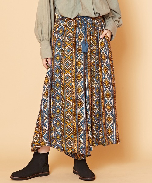 \コーデの主役に大活躍/ ボリュームたっぷりで、まるでスカートのようなシルエットのワイドパンツ。レーヨン素材ならではの落ち感で、ゆったりと楽な穿き心地。フォークロアテイストな柄で華やかな秋冬コーデに。 ・サイドポケット付き。 ・ウエストゴム紐仕様 MAX~106cm ●ネイビー:NAVY FLOWER ●パープル:PURPLE ROSETTE ●イエロー:YELLOW AFRICAN ●レッド:RED NATIVE ※こちらの商品は1点1点職人による手作りとなります。その為、生地の取り方により柄の配置や形・色合いなど若干異なる場合がございます。あらかじめご了承ください。 Amina Collection Co.,LTD.