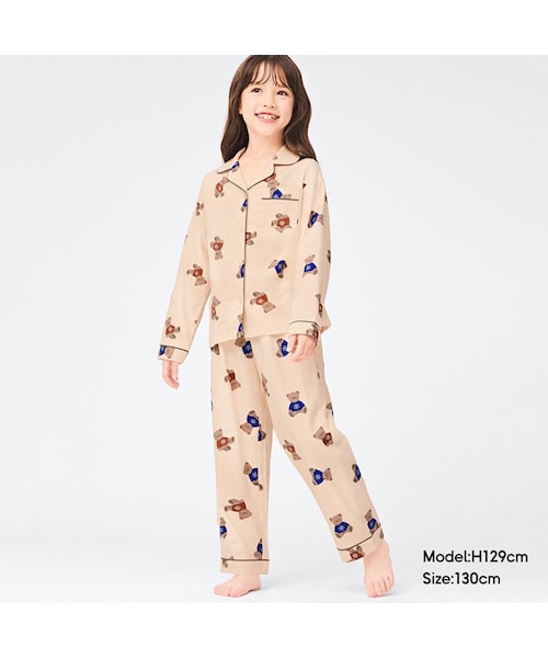 ふんわりとしたやわらかい肌触りのフランネル素材を使用したパジャマ。第1ボタン付きで襟元の開閉を自由にできるのが嬉しいポイントです。あたたかいニットを着たかわいいくまの総柄も魅力的。WOMENSとお揃い企画で親子リンクも叶うので、おうち時間も一緒におしゃれが楽しめます。【注意事項】(※100・160サイズは、オンラインストアのみでの販売となります。)