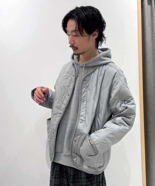 トレンドのM-65ライナーブルゾンをサイズ感を調整してより着用しやすくアレンジ。中綿入りで保温性も抜群です。 ・デザイン M-65ライナーをアウター風にアレンジしてより着やすくしています。 オリジナル同様にひょうたんキルトでアクセントにしています。 前立てやポケット口に別生地をパイピングする事でアクセントと補強出来るようにしています。 中綿を使用しているので暖かく、保温性もあります。 袖口にはオリジナルワッペンを付けてアクセントにしています。 ・シルエット ゆとりのあるサイズ感なので少し大き目のインナーでも問題なく着用出来ます。 丈感もちょうど良いので、色々なシルエットのパンツにもコーディネート出来ます。 ・ファブリック 布地の裏に熱と圧力による加工を施し、表地の機密性を高め光沢を出す加工を行うと、表面がロウに似た濡れた様な独特のコーティングになり光沢感が出るシレー加工を施しています。 ・スタイリング 衿が無いので、スウェット、パーカー、シャツどんなインナーでも合わせられます。 ボトムはテーパードシルエットなどのすっきりしたボトムに合わせるのもおすすめです。 ***************** 裏地:あり 伸縮性:なし 光沢感:ややあり 生地の厚さ:普通(中綿のボリューム感あり) 透け:なし ***************** <スタッフ着用コメント>本社 Hさん身長:178cm/体重:66kg/体型:普通/普段サイズ:48(L)/着用サイズ:48(L) サイズ感:少しゆったりとした程よいサイズ感。 素材感:やや光沢がある素材感、見た目以上に軽い。 着心地:軽くて暖かい。カーディガン感覚で着用出来る。