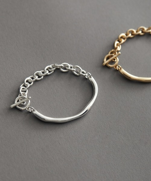 アクセントにもぴったりの大人なブレスレット【デザイン・シルエット】ニュアンスラインのメタルとチェーンとの掛け合わせで大人っぽく着用いただけるブレスレット。マンテル仕様なので着脱もラクチンです。シーズンレスなデザインなので長くお使いいただけます。【カラー】シンプルなシルバーと女性らしさをプラスしたゴールドの2色展開。※画像の商品はサンプルです。 実際の商品と仕様、加工、サイズが若干異なる場合がございます。