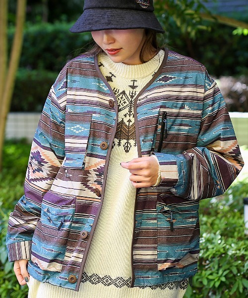 アウトドアで活躍間違いなし!機能性抜群なノーカラージャケット■デザインお外でのアクティビティがより快適になるアイテム。燃えにくい特殊な素材を使用し、撥水加工を施しているので、キャンプやバーベキュー、DIYなどアウトドアシーンで大活躍!!ファスナー付きの大きめポケットも4つあり、細かい道具を持ち歩くときに便利ですよ。ノーカラーで首元をすっきりとさせ、パーカーなどの上から羽織りやすいのも嬉しい◎アクティブなシーンの他に、タウンユースにも使える、着回し力の高いデザインです。チチカカらしいサラッペ柄2色と、背中のネイティブラインが印象的なブラックの計3色をご用意しました。■サイズ感レディースフリーサイズゆったりとした程よいルーズ感でノンストレスな着心地。■素材感シャカシャカとしたスポーティーな質感。撥水加工を施しているので、ちょっとした汚れもさっとふけて、雨にも強い◎また、 燃えにくい特殊な機能を兼ね備えていて、バーベキューやアウトドアのシーンにもおすすめです。※不燃素材ではありませんので、長時間の火の粉の付着などにご注意ください。■スタイリングふんわりとしたフレアスカートと合わせて、ガーリーミックスに!同シリーズのパンツと合わせても、ゆるっとカジュアルに仕上がってオススメです◎■カラーブラック/ピンク×グリーン(その他1)/パープル×ターコイズ(その他2)---------------------------------透け感:透けない伸縮性:なし裏地 :なし光沢 :なし生地の厚さ:薄手ポケット:あり---------------------------------【スタッフレビュー】◆厚手のトップスもあわせやすい!サイズ:FREE 色:ブラックしゅー 身長:156~160cm---------------------------------身長158㎝、肩幅が広いぽっちゃり体型です。通勤用に使っています◎全体的にゆとりがあるサイズ感で、襟もないからパーカーやニット、フリースなど厚手のトップスにも合わせやすくて重宝してます。袖が二層構造になっていて、一見ゴムが入っているようには見えないスタイリッシュさがポイント!腕まくりしやすいのが使っていて楽ちんだなと感じています。たたんでもしわになりにくいし、軽量なので持ち運びもしやすいと思います♪【TITICACAのお買いものをお楽しみいただくために!】▼商品のお気に入り登録完売カラーの再入荷通知や、ラスト1点の通知、セールの通知も受け取ることができます。▼ブランドのお気に入り登録新商品や再入荷など、いち早くブランドのお得な情報を受けることができます!