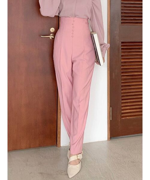 トレンドのプチボタンをフロントに使い、華やかなデザインに仕上げています。通常のラインアップよりも更にハイウエスト位置に設定して究極の足長効果を実現。裾にかけてタイトになっていくスリムなテーパードパンツです。シャツアイテムとでTOPSにボリュームを作ったコーデがお勧め。部分開きなどのデティールアイテムを合わせてバランスの良いスタイリングを実現。