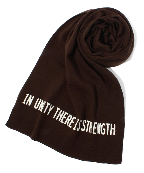 "IN UNITY THERE IS STRENGTH"(団結は力なり)ということわざをプリントしたニットマフラー。 クラシカルなジムキャップをベースに、適度なボリューム感のマフラーにアレンジしたDOORSのオリジナルデザインです。