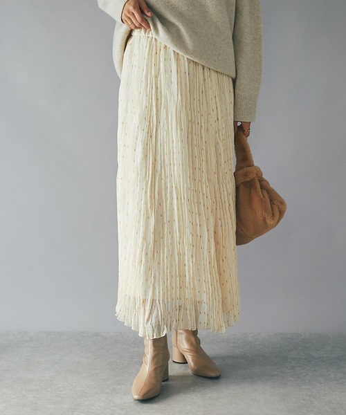 キラキラとしたラメデザインが着映えを叶える ●POINT ・ラメ糸を使用し華やかさをプラス ・シアー感があり軽やかさ◎ ・ドロスト仕様でイージーな履き心地 ●デザイン キラキラ輝くラメ糸が織り込まれた着映えスカート。 シアー素材全体にワッシャープリーツを施したリラックスムードと華やかさを兼ねたデザインで、幅広いスタイルにマッチする1枚です。 ゴールド&シルバーラメ入りのアイボリーと、同色ラメ使いのブラックの2色展開。 ブラック無地感覚で着用出来る為、気負わずコーディネートに取り入れていただけます。 軽やかな素材感でニットやスエットを重ねても着ぶくれしにくく、サラッとした着用感も魅力。 ウエストはゴム仕様でイージーに着用頂けます。ウエストベルト内側にサイズ調整の紐が付いているのもうれしいポイントです。 ご自宅で手洗い可能。 ●おすすめコーディネート これからのシーズンにもピッタリの軽やかな素材。 今季らしい重めなニット素材を合わせたバランスがトレンドライクに着こなせるポイントです。 ふんわりと軽やかでありながらも広がり過ぎないシルエットで上品なスタイリングにもマッチします。お出かけシーンが増える季節にオススメ。 ●素材 表地 ポリエステル 100% 裏地 ポリエステル 100% 洗濯方法:手洗い 透け感:ややあり 裏地:あり 伸縮性:なし 生地の厚さ:ふつう 光沢:なし ファスナー:なし ポケット:なし 【骨格タイプ】 ・ストレートタイプ 全体的に筋肉質で体にメリハリがあるタイプ 腰とバスト位置も高く厚みがあり、ひざ下は細目 ・ウェーブタイプ 全体的に柔らかな曲線の体のライン 重心が下半身にあり、上半身は華奢で薄い印象 ・ナチュラルタイプ 筋肉や脂肪があまり感じられなく重心の偏りがないタイプ 骨組みはしっかりしており、関節が目立ちやすい ========================== 【注意点】 ※画像の商品は光の照射や角度、お使いのモニター環境により、実物と色味が異なる場合がございます。 あらかじめご了承下さいませ。 ========================== 【お買い物をもっと便利に楽しく♪】 『♡』をクリックでお気に入り登録 ✓「商品のお気に入り登録」で・・・ ラスト1点や再入荷の通知が届きます。登録して頂いた商品だけが対象となる、あなただけのタイムセールが開催されることも! ✓「ブランドのお気に入り登録」で・・・ 新商品や再入荷など、いち早くブランドのお得な情報を 受け取ることができますので、ご登録をおすすめします! ==========================