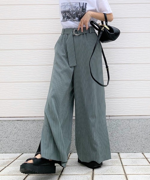 ピントライプ柄がシックな印象のベルト付きワイドパンツです。サラッと素材で穿き心地の良い大人ワイドパンツ。ステッチはカラーを使い、サイドにはスリットを入れて抜け感をプラス。ボリューム感があるリラックスシルエットですがシックな柄ですのでオフィスでもお使いいただける、オンオフ兼用アイテム。また、素材にはポリエステルも入っているので、洗濯しても乾きやすくシワにもなりにくいのでお手入れも楽ちん。《インフォメーション》◆商品のお気に入り登録完売していても再入荷時に再入荷通知を受け取ることができますので、是非ご登録ください。◆ブランドのお気に入り登録新商品や再入荷などの情報を受け取ることができますので、是非ご登録ください。