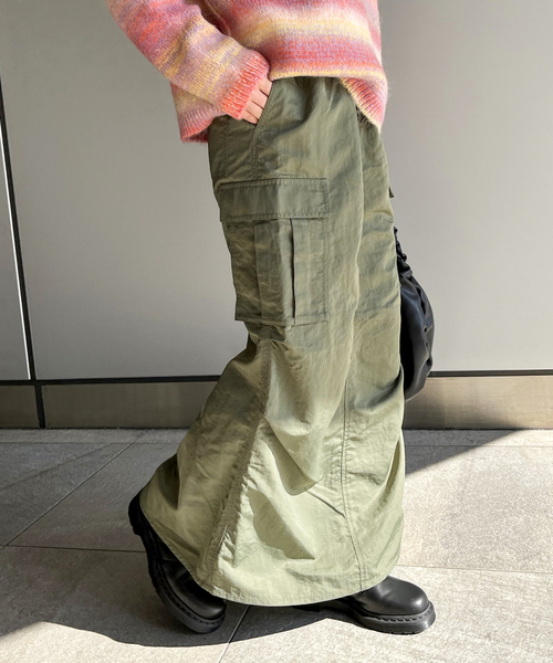 【2022AW】JOINT WORKS※こちらの商品は、品番:22060701158030の追加商品です。※ホワイトは、品番:22060701158030にて販売中です。人気のカーゴマキシスカートが再入荷!90年代アメリカ軍 のUS.ARMYスノーカモパンツを参考にスーパーワイドカーゴパンツのディテールをマキシスカートにしました。バックデザインに三角マチのややマーメイドシルエットでスッキリ着られる1枚。程良い光沢感でヘアリーなニットはスタイリッシュに決まります。**********************透け感:ややあり(ホワイトのみ)裏地:あり(ホワイトのみ)伸縮性:なし光沢感:ややあり生地の厚さ:普通**********************【スタッフ着用コメント】《スタッフ staff.s》身長:165cm/普段サイズ:S~M/着用サイズ:Mサイズサイズ感:ウエストはゴム仕様でややゆったりとしていますが、ドロストで調整が可能です◎腰周りにかけてゆとりがあるので、体型カバーにもなる一枚です。素材感:ナイロンのシャカシャカとしたスポーティさに、綿のしっとり感が加わった着心地の良い生地感です◎着心地:窮屈感が無く、リラックス感のある着心地です。スリットが無いので足捌きが特別良いというわけではありませんが、普段穿く分には問題なく、シルエットがとても綺麗に出ます◎**********************※取り扱いについては、商品についている洗濯表示にてご確認下さい。※照明の関係により、実際よりも色味が違って見える場合があります。またパソコン・スマートフォンなどの環境により、若干製品と画像のカラーが異なる場合もございます。※商品の色味は、商品アップ画像をご参照ください。モデルサイズ:身長:166cm 着用サイズ:M本体:手洗い可能