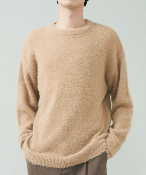 ◆今季トレンド!毛足感のあるシャギー素材を使用したクルーネックニット◆ 【デザイン】 毛足感のあるシャギー素材を使用したトレンドニット。 シルエットは身幅・肩幅にゆとりを持たせたワイドシルエット。 取り入れるだけで冬らしいスタイリングに早変わりするアイテムです。 ユニセックスでの着用も可能なため、女性にもオススメです。 【素材】 ナイロンアクリルのシャギー素材を使用。 ウールが入っていないため、ちくちくしずらく肌触りも滑らかで柔らかく気持ちいいです。 【スタイリング】 ボトムははきれい目スタイルであればスラックス合わせ、カジュアルスタイルであればタック入りなどのゆとりのあるパンツとあわせるとバランスが良いコーディネートができます。 アウターではダウンブルゾンやウールコート合わせなど汎用性が高く、程よいアクセントになります。 ---------------- 透け感:なし 裏地:なし 伸縮性:あり 光沢感:なし 生地の厚さ:普通 ---------------- ≪お気に入り登録機能の使い方≫ ■商品のお気に入り登録(ハートマークをクリック) 再入荷通知や値下げ等、お得なご案内を受けることができます。 ---------------- ※【全色】44/S サイズ、【オレンジ】50/XLサイズはWEB限定販売です。 ※お使いの液晶環境により、色味が多少異なる場合がございます。予めご了承ください。 ※サンプルにて撮影しておりますため、お届けの商品と仕様が若干異なる場合がございます。予めご了承ください。