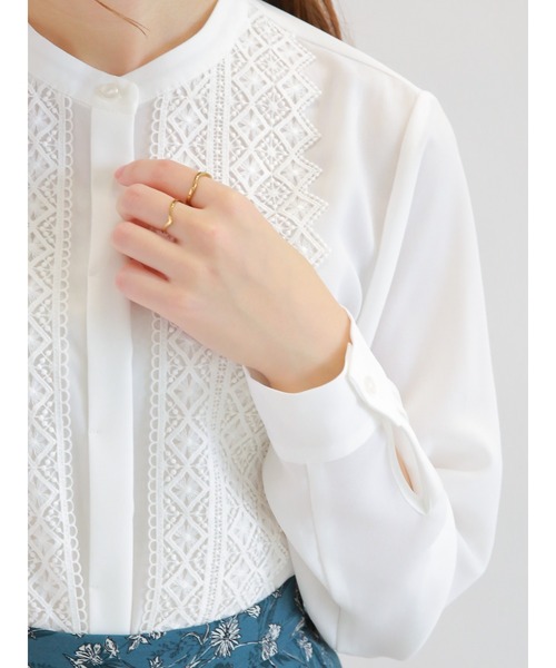 フロントレースがエレガントなムードを漂わせるブラウス。すっきりとしたバンドカラーと比翼フライで、上品クラシックなムードを演出。柔らかな生地感で着心地も良く、女性らしい優しげな表情をプラスします。普段使いはもちろん、デートやオフィスコーデなどシーンを問わずに活躍してくれるアイテムです。※商品画像は、撮影環境やお客様のご利用のPC・スマートフォンのモニター環境などにより実物と色味に差異がある場合がございます。