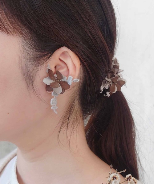 ・*:・秋色アジサイの イヤリング・:*・ 秋冬にぴったりなこっくりカラーのシリーズ* フロッキー素材の滑らかな生地でお作りした 秋色アジサイをメインに、 レースや布花を手染めして合わせました。 イヤリングはアシンメトリーに。 耳元にお花が咲いているように見せるアジサイのお花から 自由に伸びていくヤマイモヅルのレース。 そのツルに、こぼれるように添えた花びら。 可愛らしさの中に 植物の自由さを添えた作品です。 オリジナルでお作りしているレースは ひとつひとつ少し形が違うのも、魅力のひとつ。 同じシリーズのヘアクリップと合わせて 秋冬のコーディネートをお楽しみください* 秋冬カラーのシリーズ▽ デイジーとあじさいの小さなコサージュ:3002688 ヤマイモレースとベロアのリボンコサージュ:55085841 【m.soeur(エムスール)*】 m.soeur(エムスール)は京都発のハンドメイドアクセサリーブランドです。 植物の美しさや生命力を表現しつつもお洋服に寄り添うような、ナチュラルでクラシカルなアイテムを 制作しています。 一点一点人の手で作り上げられる手作りのアイテムは温かみがあり、使い込むごとに味わいをましていきます。 ・*:・ ・:*・ ・*:・:*:・:*・ 【注意事項】 ※こちらは手染めを施している商品となります。シミのように見える部分がある場合がございますが、染めの色となり、アンティークな風合いを出すためのものですので、一点一点発色が少々異なった仕上がりとなっております。 ※手作業のため、画像の商品と色、形、大きさが多少異なる場合がございますので、予め御了承下さい。 ※色落ちする場合がございますので水や雨等には十分ご注意下さい。 ※大変デリケートなお作りとなっておりますので、お取り扱いには十分ご注意下さい。
