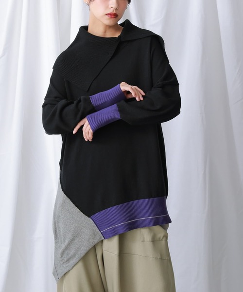 『モードに、雰囲気格上げ。』纏うだけでセンスに差のつく、個性派デザインニット。クシュッとした襟のボタンで、シルエットの変化を楽しめる。こだわりの3色使いの配色と、計算されたアシンメトリーな変形デザインが、着るだけでハイセンスを叶える逸品です。柔らかなコットン100%のニットを使用しているから、着心地の良さも叶えてくれる。クリーンでモードな世界観に包み込まれる≪ kOhAKU ≫。服と体の関係性を様々な角度から追及するドメスティックブランド。唯一無二の存在感を放つ≪kOhAKU≫デザイン襟配色アシメニットです。