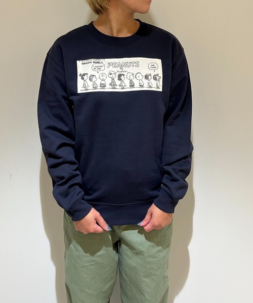 親子お揃いで着用して頂けるアイテムです シンプルなシルエットのスタンダードスウエットシャツ。軽くて程よい厚みのあるコットン裏毛生地を使用しています。吸水性・伸縮性の優れた裏パイルのコットン裏毛に、襟リブ・袖口・袖下にダブルステッチを施した、丈夫さとリラックス感を兼ね備えたスウェット。 デザインはシンプル・スタンダードスタイルで、秋冬のアウター・インナーとしてだけでなく、ルームウェアとしても重宝するアイテム。 フロントに施したPEANUTSのワッペンがアクセントになっています。