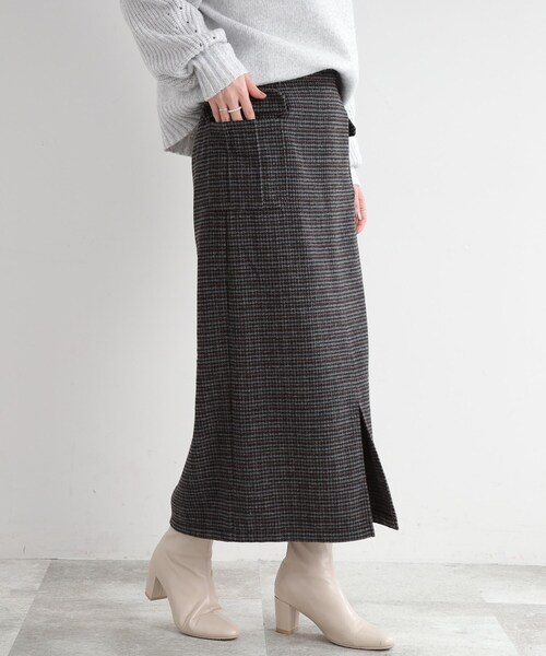 ---------------------------------------------------- 千鳥柄がレトロな雰囲気のナロースカート! ---------------------------------------------------- 【デザイン】 シンプルなデザインに、パッチポケットがアクセントになったこだわりの1枚です。 フロントのスリットが女性らしさをプラスしてくれます。 ※ポケット数:横×2 【素材】 ウール(毛)混の程よく肉感のある暖かみのある素材。 ※膝まで裏地あり 【スタイリング】 カジュアルにスウェット合わせや、ニットを合わせてフェミニンに、どんなアイテムとも相性良く活躍してくれます。 モデル情報:身長163cm B81 W56 H82 着用サイズ:02(M) 店舗へのお問い合わせ商品番号:741-75024 ●製品寸法: 02(M):W66~78cm H90cm 総丈87cm 03(L):W68~80cm H92cm 総丈89cm 備考: