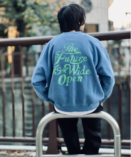 ■デザイン 70年代風のレトロなロゴとカラーリングがポイントのクルーネックスウェット。 胸元には目の引く★と、背面には「The Future Is Wide Open」のメッセージロゴがデザインされた一枚。 ゆとりを持たせた袖や、計算されたオーバーシルエットで、 さらりと着るだけでワンランク上のカジュアルスタイルに。 ピグメント加工を施すことで、 こなれ感のある落ち着いた色味に仕上がっています。 フリーサイズなのでレディースでも着用いただけます。 ■素材 ベーシックなコットン素材を使用し、心地よく着られる一枚。 ■コーディネート 細身のパンツからワイドパンツまで様々なボトムスと相性のよい着丈でバランス良く着こなせます。 ------------------------------------- 透け感:なし 裏地:なし 伸縮性:ややあり 光沢感:ややあり 生地の厚さ:薄地 -------------------------------------