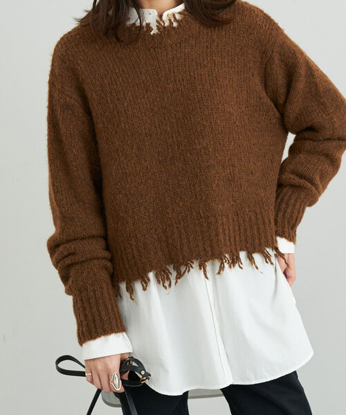 【2022AW】 SLOBE IENA スタイリスト安西こずえさんとのコラボレーションアイテム! ニットとカットソーがセットで登場! モヘヤ混のふわふわとした毛吹いた表面感が魅力のニット。 クロップド丈に仕上げ、襟元と裾にはクラッシュ要素を取り入れました。 インナーのカットソーは綿素材で、柔らかく肌触りがとても良いです。 ニットは1枚で着るのはもちろん、他のアイテムと合わせたレイヤードスタイルなど バリエーション豊かにスタリングを楽しめます。 シリーズでパンツ(品番22030912412030)もございます。 ※インナーの採寸について 肩幅:44cm 身幅:46cm 着丈:53cm 袖丈:71cm ※こちらの商品はアイテムによって、生産国・アテンションが異なります。 《生産国》 ニット:中国 インナー:日本 《アテンション》 アクリルニット製品 、獣毛混・甘撚り・起毛製品 :ニットのみ ********************** 透け感:あり(インナーのみ) 裏地:なし 伸縮性:あり 光沢感:なし 生地の厚さ:普通 ********************** 【スタッフ着用コメント】 《スタッフ名:rino》 年齢:20代前半/身長:159cm/体型:細身/普段サイズ:S~M/着用サイズ:フリー サイズ感:首まわりにゆとりがあり、着丈も長すぎないので、 一枚で着てもレイヤードスタイルでもサマになる。 素材:柔らかいニット素材。 着心地:軽くて柔らかい生地感なので、温かく着られます。 ********************** ※取り扱いについては、商品についている品質表示でご確認ください。 こちらの商品は、SLOBE IENAでの取り扱いになります。 直接店舗へお問い合わせの際はSLOBE IENA店舗へお願い致します。 ※照明の関係により、実際よりも色味が違って見える場合があります。 またパソコン・スマートフォンなどの環境により、若干製品と画像のカラーが異なる場合もございます。 予めご了承ください。 ※商品の色味は、商品アップ画像をご参照ください。 グレーA着用スタッフ身長:165cm 着用サイズ:フリー ブラウン着用スタッフ身長:159cm 着用サイズ:フリー 詳細着用スタッフ身長:161cm 着用サイズ:フリー ニット:ドライクリーニング, インナー:手洗い可能