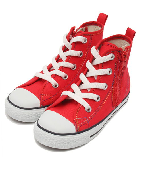 チャイルド オールスター RZ HIのリニューアルモデル。サーフアパレルに使用される「レインボーカラー」をステッチやヒールラベルに落とし込んだアイテム。 持ち手の大きいファスナーに、つまみやすい広めのかかとテープでお子様自身でも脱ぎ履きしやすい仕様にリニューアル。 しなやかなラバーや、足の曲がる位置でしっかり屈曲するソール設計。 カップインソールにはサイズ変更の目安が分かるフィッティングチェッカー付き。 ファミリーペア(アダルト、キッズ、ベビー)モデル。