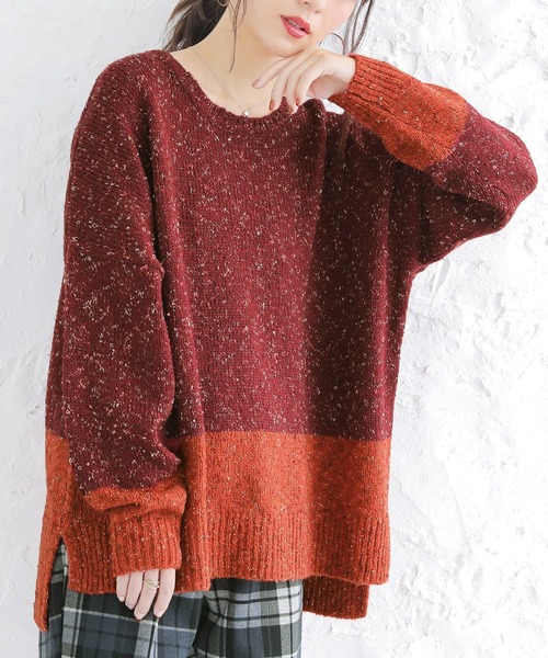 『“お洒落色”を纏う。』派手過ぎず程よくコーデを彩ってくれる♪大人可愛さが惹き立つ、配色デザインニット。同色系の濃淡で表現された袖と裾の配色切り替えがこれからのお洒落をランクアップ。前後差のある着丈で気になる部分もカバーしてくれる♪両サイドにスリット、ストンとしたデザインでどんなボトムスにも合わせやすくなっています。カジュアルさの中に程よい華やぎを添えてくれるミックスヤーンニット。程よい厚みと柔らかな着心地でこれからの季節のお洒落に活躍してくれます。今、好きな物、興味あることを自由な発想で表現できる≪ n'OrLABEL ≫。「実用性と機能性、そして遊び感覚」、多面性を楽しめるピュアでモードなデザインライン。着映え確実、お洒落見えする≪n'OrLABEL≫配色ミックスヤーンニットです。