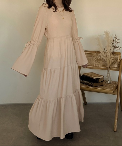 大人っぽさと可愛さを兼ねそろえたロングワンピース。 ■Point ・一見シンプルなデザインですが、小さな凹凸感のあるジャガード織の生地や 袖のデザインがこなれた雰囲気漂うワンピース。 ・袖の肘部分に紐が入っており、縛ると袖口がフレアになるお洒落なデザイン。 ・歩く度ふわっと広がるスカート部分やフレア袖が女性らしい印象に。 ■Coordinate ・秋口はボアベストと合わせて程よくカジュアルなスタイリングがおすすめ。 ・寒い冬場はタートルネックやアームウォーマーとの着用で暖かさをプラス◎ インナー次第でロングシーズン着用可能です。 ………………………………… 透け感:アイボリーややあり 同色系のインナー推奨 伸縮性:ややあり ウエスト後ろ部分ゴム仕様 生地の厚さ:普通 ………………………………… apresjour clair (アプレジュールクレア) apres_jour から大人の女性に向けた新ライン誕生 淡色をテーマにカジュアル×フェミニンスタイルをお届けします。 毎週木曜21:00〜新作発売 -オフィシャルInstagramにて最新情報や限定情報を毎日更新中!- ※ご覧のモニター環境や撮影環境により実際の商品と多少色味が異なって見える場合がございます。 ご理解の程よろしくお願いいたします。 【お買い物をよりお楽しみいただく為に♪】 ▼商品のお気に入り登録をおすすめします ♡をクリック! 完売カラーの再入荷や、ラスト1点の通知、 セールの際の通知を受ける事ができます。 ブランドのお気に入り登録も ご一緒にお願い致します。