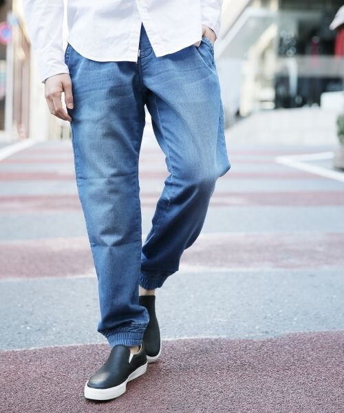 柔らかな履き心地のデニム風イージー<デザイン>ウエスト・裾にゴムを入れた、ワイドシルエットのイージーパンツです。しっかりとしたコシのある素材を使用しており、季節を問わず大活躍するアイテム。裾をしぼったトレンドのデザインで、ローカットのシューズとの相性が抜群!リアルな色落ちも特徴で、今後の経年変化も楽しんでいただけるアイテムに仕上がっています。<素材>スウェットのような柔らかな履き心地と、デニムのようなカラーを表現した【ジョグデニム】を採用。ごわつきを抑えた、ストレスのない肌触りが一番のポイントです。<カラーバリエーション>濃さの違うインディゴブルーを2パターンご用意しました。どちらも履き込むほどに馴染み、味が出てきますので、お好みのカラーをお選びください。