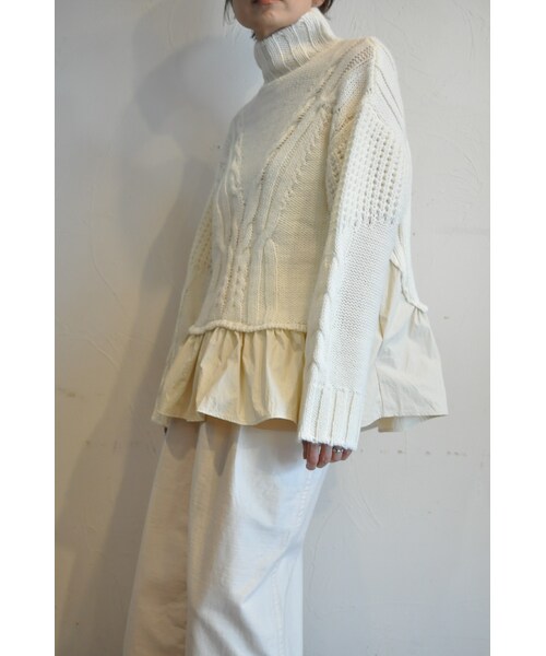 色々なケーブル柄をコンビネーションしたロービングニット。 手編み風にざっくりと3Gに編み、衿、袖口はワイドリブになっています。 脇から裾にかけて、異素材タフタで切り替え、ボリュームあるAラインシルエットです。
