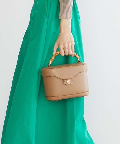 GISELe 5月号掲載アイテム(カラー:ブラウン) スムース調の合成皮革を使ったバニティバッグは、バンブーハンドルをポイントに大人可愛いデザインに。 取り外し可能なショルダー付きで2way仕様。 斜め掛けはもちろんハンドバッグ風に持って頂くことも可能です。 口元の小さい捻り金具は上品ながら高級感もしっかりあります。 ※商品画像はサンプルのため、色味やサイズ、仕様等に変更が生じる場合がございますので、予めご了承ください。 PC対応:× A4収納:× ハンドルの高さ:6cm ショルダーベルトの長さ:88~125cm 肩掛け:〇 バッグの口開けタイプ:捻り金具 ポケット個数外側:なし ポケット個数内側:オープンポケット3 裏地:綿麻