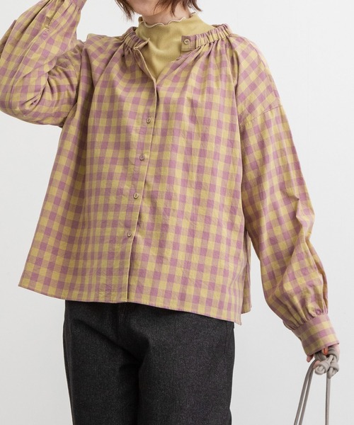 POU DOU DOU オリジナルテキスタイルのブラウス ■Point ・微妙起毛をかけた温かみのあるキャンブリック生地でオリジナルのギンガムチェックを織りました。 ・色の掛け合わせがポップな雰囲気で重たくなりがちな冬のコーディネートのアクセントに。 ・ネックラインにゴムでギャザーを寄せ、ふんわりとしたシルエットに仕上げました。 ・前後両面で着用可能です。 -------------------- 透け感:なし 厚さ:普通 伸縮性:なし -------------------- POU DOU DOU プードゥドゥ ひと手間加えた存在感のある「日常着」 いつまでもときめきとかわいいを忘れない方への 愛着を持てるワードローブ = お気に入り登録がおすすめ!= POU DOU DOUのお得な情報をいち早くお届け致します◎ アイテムをお気に入り ⇒ SALE START / 完売COLOR再入荷 / LAST1点 etc... ブランドをお気に入り ⇒新商品 / 再入荷 /クーポン・セール情報 etc...