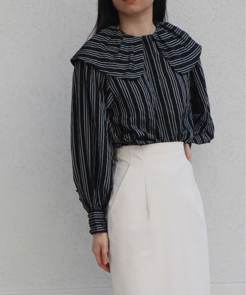 立体感のあるタックを細かく入れた大きな襟がポイントのグッドガールなスタイリングにも重宝するボリューム袖ブラウス。顔まわりを華やかに彩る立体的に作った襟が特徴ながらも袖のボリュームやカフスまわりをしっかり丁寧に仕上げることで大人も使えるアイテムに。パンツスタイルに合わせたり、ワンピースのインナー使いにもちょうどよい身幅が◎