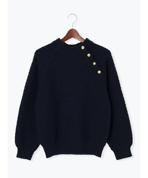ふっくらとした鹿の子編みとゴールドのボタンがアクセントになったニット。アシンメトリーなデザインがコーディネートのポイントに。ラグラン切り替えのスリーブで華奢見せ効果も期待できます。ベーシックなカラーでコーディネートにも取り入れやすく、デイリーユースにも重宝しそうなアイテムです。※商品画像は、撮影環境やお客様のご利用のPC・スマートフォンのモニター環境などにより実物と色味に差異がある場合がございます。