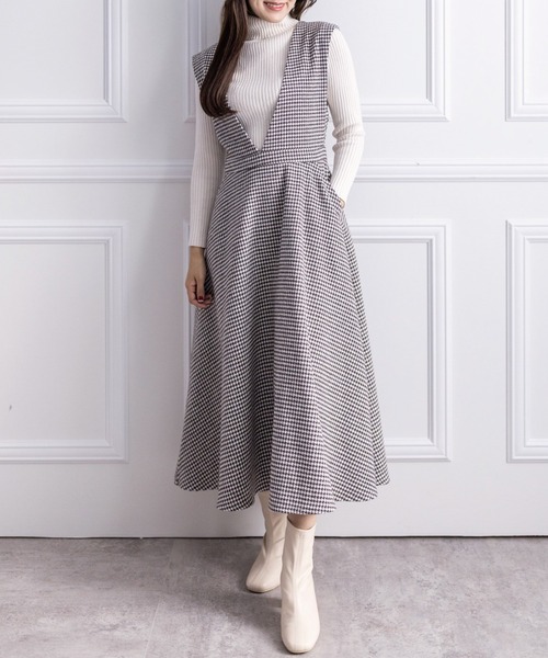チドリガラVネックジャンスカ 【デザイン】 ザックリ開いたVラインとふわっと広がるフレアな裾がエレガントな印象を与えてくれるジャンパースカート。全体的に上半身が軽やかに見え、レイヤードスタイルも自由自在に楽しめるアイテムです…♪ 【素材感】 弾力性のあるアクリルニット素材 伸縮性:なし / 透け感:なし / 裏地:あり / ウエストゴム:あり 水洗いによる洗濯不可 / ドライクリーニング可 【コーディネート】 合わせるアイテムによってオールシーズンご活用いただけるアイテム。 普段使いからオフィスカジュアルまで幅広く対応が可能◎ 全体のコーデが固まりやすいアイテムなので、日々のコーデに迷いが生じた際には是非一着取り入れてみてください。 【※お取り扱い上のご注意】 1:モニター環境等により実際の商品と多少色味が異なって表示される場合がございます。予めご了承下さい。 2:屋外で撮影された商品は、天候により多少実際のカラーと異なる場合があります。商品のカラーはトルソー(マネキン)の商品画像をご参照ください。 3:濃い色の商品は、お洗濯や摩擦等による移染にご注意ください。 4:末永くご愛用頂く為に、アテンションタグ・洗濯ネームを必ずご確認の上、着用又はお取り扱い下さい。 5:生産時期により、色、サイズ、デザイン、素材の質感が多少が異なる場合がございます。あらかじめ御了承下さいませ。