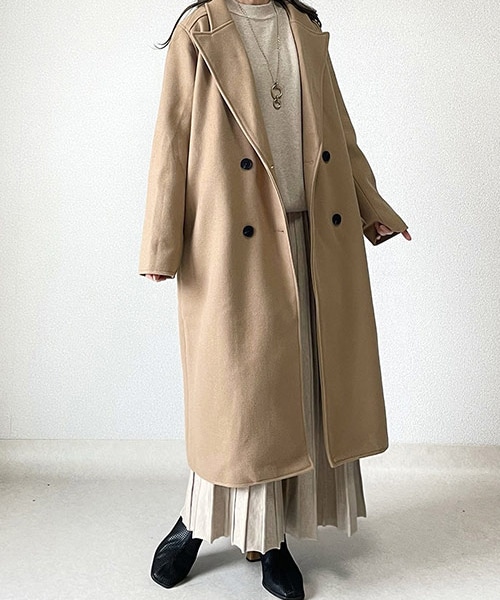 大きな襟と深いネックが抜け感を感じます。 肉厚なウール混で暖かみと上品さのある落ち着いたコートです。 ゆったりサイズなので、中に着込むこともできます。 裏地付きです。 着用カラー:ベージュ