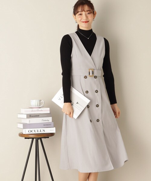 【デザイン】 人気のトレンチ風ジャンスカが秋冬らしい微起毛素材で登場です。 クラシカルなスタイルが簡単に決まる美シルエットのワンピース。 少し高めの位置で切り替えたウエストが綺麗なシルエットをつくり、 アクセントのバックルがポイントに。 肉厚なニットを着てもOKな程よくゆとりのある身頃と腕周りで、 冬のレイヤードコーデの幅が広がります♪ タイツとブーツに合わせてシックな着こなしがお勧めです。 ※ポケットなし 【素材】 パウダータッチな微起毛感が秋冬らしい素材です。 こちらの商品は主に冬に着用いただける商品です。 モデル情報:身長171cm B80 W59 H88 着用サイズ:00 店舗へのお問い合わせ商品番号:P93-55026 ●製品寸法: 00(フリーサイズ):総丈114cm B88cm 肩幅35cm W80cm H102cm 付属ベルト全長113cm 幅5cm 対応サイズフリーcm 備考: