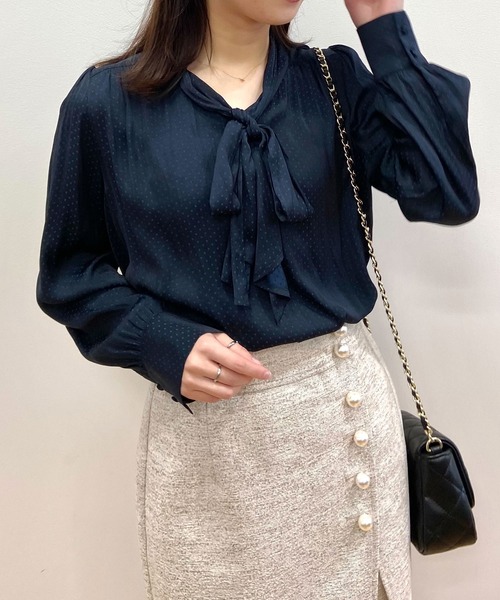 ドットのジャカード素材を使った、華やかなボウタイデザインブラウス。【素材】やわらかくとろみのある、ポリエステルのドットジャカード素材を使用。これからのニットとのレイヤードスタイルでもすっきりと着用できます。また季節問わず着て頂ける素材感なので汎用性高いのもポイント◎マシンウォッシャブル機能付き。※こちらの商品は透け感があるため、インナーの着用をおすすめします。【デザイン】一枚で着用はもちろん、これからの寒くなる時期のニットの中に着るレイヤードスタイルにもぴったりなブラウス。前のボウタイ部分はリボン結びでも、一回結んで垂らしても着て頂けます。とろみ感のある素材感なのでインでもアウトでもきまるシルエットです。こちらの商品は主に冬に着用いただける商品です。モデル情報:身長168cm B76 W58 H86 着用サイズ:38(M)店舗へのお問い合わせ商品番号:N02-85014●製品寸法:38(M):着丈56cm B104cm 袖丈57cm 肩幅36cm備考: