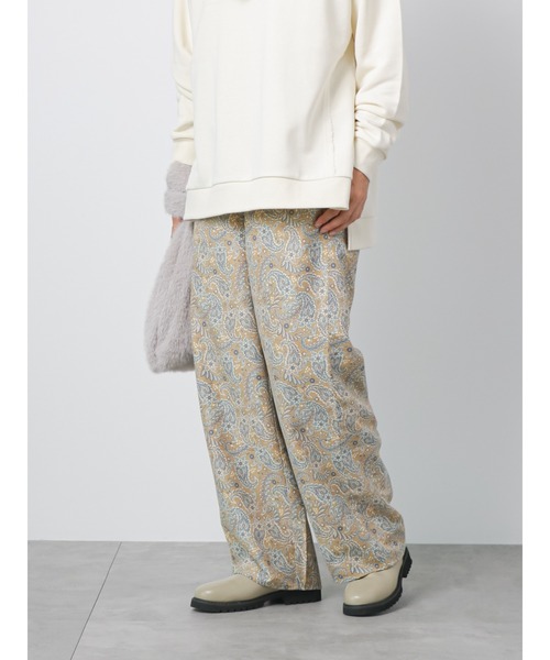 程よい起毛感があり手触りが滑らかなペイズリー柄パンツ。すとんとしたシルエットで、ラフな着心地を実現してくれます。ウエストの内側にはドローストリングをあしらい、サイズ調整できるのも魅力◎無地のトップスと合わせてメリハリのあるスタイリングが楽しめるアイテムです。※商品画像は、撮影環境やお客様のご利用のPC・スマートフォンのモニター環境などにより実物と色味に差異がある場合がございます。【その他採寸】F ウエスト:[後ゴム仕様]66cm