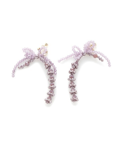 【アシンメトリーリボンで大人モードに仕上げたイヤリング】 【Design/Styling】 大きなリボンモチーフがあしらわれた華やかなイヤリング。アシンメトリーな形のリボンなので甘くなり過ぎず、個性的な印象に。見た目よりも軽く耳に負担がかからないのも魅力です。カットビーズをふんだんに使用したクラス感のある仕上がりで、デイリーにはもちろんパーティシーンにもおススメの1品。クリーンなムードを醸し出すホワイト、深みのある色合いで大人っぽいラベンダー、キラキラと煌めくグリーンの3色展開でお届けします。 ※照明の関係により、実際よりも色味が違って見える場合があります。 またパソコン・スマートフォンなどの環境により、若干製品と画像のカラーが異なる場合もございます。予めご了承ください。 商品の色味は、商品単品画像をご参照下さい。 ※商品画像はサンプルのため、色味やサイズ等の仕様に変更がある場合がございますので、予めご了承ください。