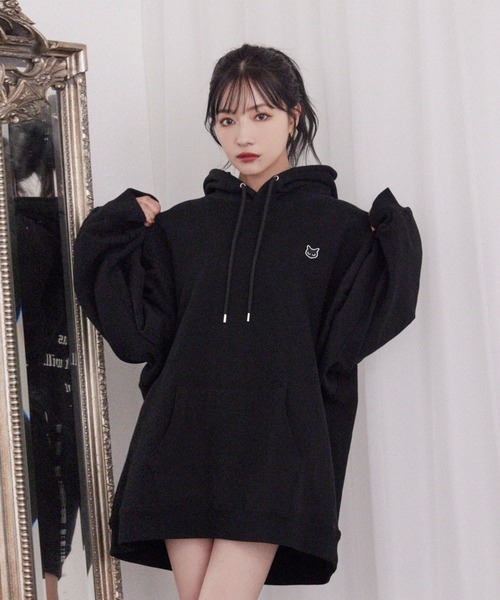 背中一面にロゴプリントが入ったプルパーカー。胸元には黒猫のワンポイント刺繍を施しています。 大きいゆったりサイズのパーカーです。