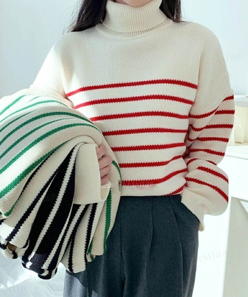 カジュアルな着こなしが魅力的なボーダー柄ニット 首元まであたたかいタートルネックタイプ ゆったりと着られるオーバーサイズでこなれ感たっぷりに着こなせます 袖が長めなのでロールアップして着ても可愛い 編み目が細かく温かさも◎ ●生地 ・ちくちくしない、若干厚手のニット生地です ※撮影時のライティング、ご覧になっているスマートフォンやPC環境などにより 実際の商品と色が異なって見える場合がございます。 ※サイズは商品によって若干の誤差がある場合がございます。 予めご了承くださいませ。 ================================= ●お気に入り登録●でいつでもチェック! ▶お気に入り登録は、ハートマークをクリックでOK 完売カラーの再入荷通知、在庫ラスト1点の通知、セールの通知を受け取ることができます。 ▶ブランドのお気に入り登録 新商品がUPされたり売り切れ商品が再入荷したときなど、お得な情報を受け取ることができます。 =================================