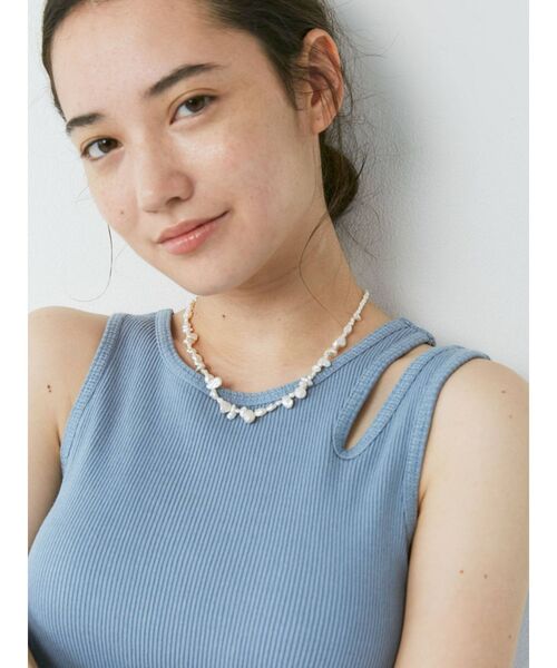 ■デザイン 淡水パールを使用したネックレス。サイズ感を大小ミックスし女性らしい印象に。ショートデザインなので華奢なネックレスとの重ね付けがオススメです。