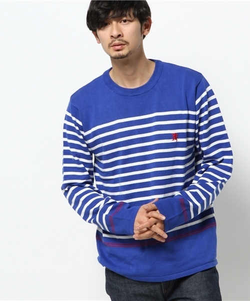 春らしいボディーカラーが魅力のパネルボーダークルーネックニット。 シルエットはスッキリとしたスリムライン。 左胸部分にブランドの象徴でもあるライオンロゴ刺繍をプラス コットン素材を使用し冬場はジャケットのインナーとして、春先は1枚でと、長い期間で着用して頂けます。