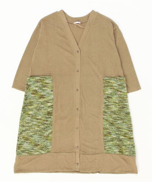 2種類のニットソーを組み合わせたロングカーディガン。サイドに切り替えたカラフルなループニットが個性的な印象に。柔らかで温かみのある素材感と、ゆったりしたサイジングが抜け感を演出してくれます。ボタンを閉じて、ワンピースような着こなすのもおすすめです。