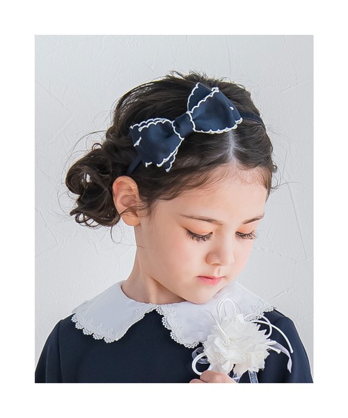 ふんわりと立体的に結んだ大きめのサテンリボンが華やかなカチューシャ。 スカラップ部分の配色の縁取りが上品で可愛らしいデザインです。 シックなネイビーと優しい印象のベージュの2色展開。 新入学や発表会などのシーンにお顔周りを簡単に華やかに仕上げてくれるカチューシャはおすすめのアイテム。 お洋服の一部とカラーを合わせるとぐっと統一感のあるコーデになるのも魅力です。 【 フレッシャーズ コレクション 】 【BeBe(べべ)】 "LOVE MODERN" 少しおませで、生意気なヨーロピアンカジュアルの提案。 時代性・流行性をとらえ、ベーシックでもワンポイントを施した遊び心、楽しさを盛り込んでいます。 シンプルだけど、こだわりのあるオリジナリティーを重視しています。