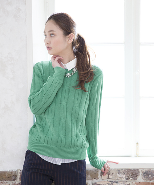 春色カラーニットで春の装い♪ 発色の良いコットンニット。 凹凸のあるケーブル編み柄で、表面感のあるデザインも特徴の1枚です。 綿混の素材は毛立ちも少なく、さらっとした着心地もポイント♪ 春らしい色合いがこれから先の時期にもおすすめです! 店舗へのお問い合わせは下記の商品名と品番をお伝えください。 商品名:5GカワリケーブルPO/LS 品番 :555605