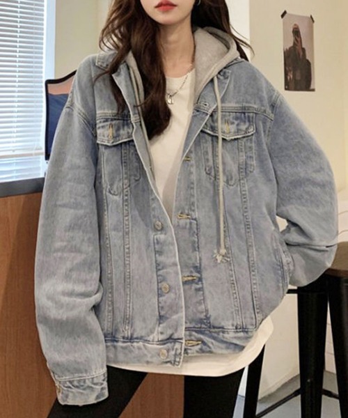 ◆POINT◇※注意:生産背景により一部ボタンホールやポケットが開いていない商品が混在する場合がございます。製品品質上問題は無く、ハサミ等で開けていただければ問題なくご使用いただけます。予めご了承くださいませ。オーバーサイジングなビッグシルエットが今風なデニムジャケット。フード付きのフェイクレイヤード仕様なので1枚羽織るだけでコーデが決まります☆メンズライクなボーイッシュストリートコーデや、スケーターMIXとの相性抜群◎あえてプリーツのワンピースや花柄のスカートなどの甘めなアイテムと合わせた女性らしいガーリーテイストにも合わせられ幅広いコーデに組む込める万能アイテムです!【2色展開】ブルー/ブラック※着用身長によって画像イメージと異なる場合があります。 ※撮影環境により、実際のカラー、形状、デザイン等多少異なる場合がございます。 《 お知らせ 》 ▼商品のお気に入り登録 お気に入りアイテムの値下げ・再入荷・在庫1点などの通知を受け取ることができます。 ▼ブランドのお気に入り登録 新商品や再入荷、セール、クーポン配布などお得な情報を受け取ることができます。是非、お気に入り登録してみてください♡