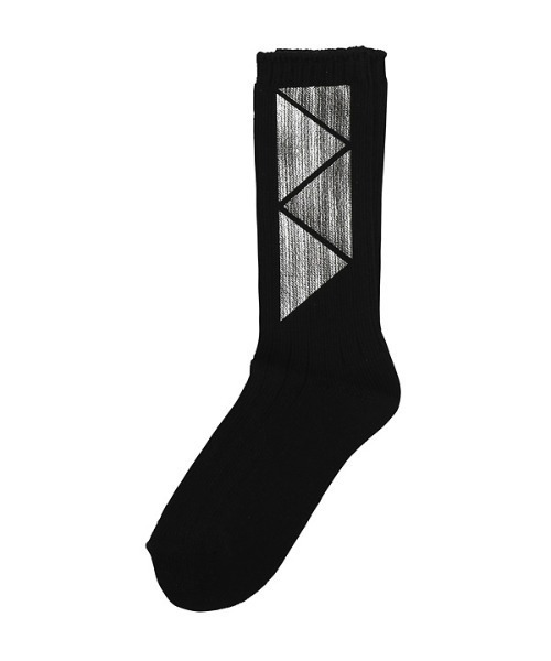 コットン素材のリブソックスに箔プリントを施したソックス。オーロラの箔を取り入れ他ジオメタリックパターンの柄模様がインパクトのある仕上がりに。箔プリントは使用するごとに割れていくデザインになります。見たの華やかさもありギフトにもピッタリのアイテムです。