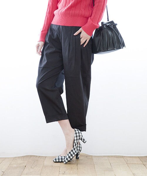 【WEB限定先行予約】 この春注目シルエットパンツが登場!もも部分にタックをデザインし、少し膨らむようなシルエットに。足先は細すぎない+クロプト丈ですっきりと見えるのでソックス合わせのスタイリングが楽しめるのもポイント☆ウエスト部分はゴム仕様なので、ジップ使いながらも窮屈さが少ないのも魅力!ワイド+テーパードの新しいシルエットをお楽しみください♪