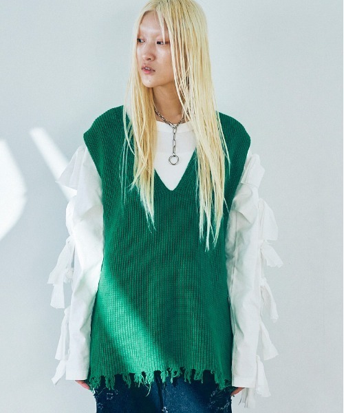 深めのVネックと裾のスリットがポイントのスリットダメージベスト 筒状のふっくらとしたリリヤーン糸を使ったダメージニットシリーズ。 1本1本がふくらみのあるのあるリリヤーン糸を使うことで ダメージ箇所にボリューム感が生まれインパクトあるアイテムに仕上がっています。 秋冬に出しているものよりもややすっきりしたサイズ感にした春夏使用のベスト。 プリントトップスなどストリート感のあるアイテムとの相性抜群。 是非コーディネートの参考にしてみてください。 ※ダメージ箇所がほどけやすいため、家庭洗濯の場合ネットにいれて単独洗いを推奨しています 生地感:厚い・ややハリのある 透け感:透けない 伸縮性:あり 裏地:なし ※こちらは参考情報となります。多少の誤差はご了承ください。 ---------------------------------------------------------------------- ◆◆お気に入り登録しておすすめ情報をゲットしよう◆◆ 【商品のお気に入り登録】 再入荷、残り1点、セール、タイムセール、クーポンなど、 いち早く受け取ることができます。 【ショップ・ブランドのお気に入り登録】 新商品、予約商品、再入荷、ショップのおすすめトピックスなど、 ショップ・ブランドの最新情報を受け取ることができます。 ---------------------------------------------------------------------- ※画像の商品はサンプルです。 実際の商品と仕様、加工、サイズが若干異なる場合がございます。 ※撮影場所により、光の当たり具合で色味が異なって見える場合がございます。商品の掛け画像をご参照下さい。