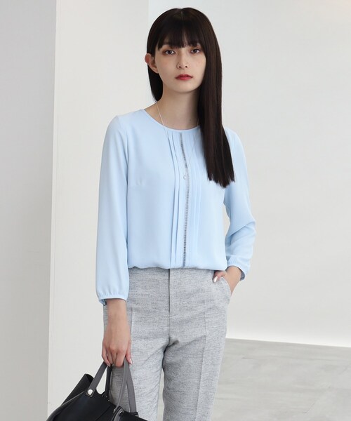 【デザインポイント】センターに華やかなレースとタックを施した1枚でも着映えし頼れるブラウスです。スカートと合わせた時に、インせずベストなバランスになる短かめの丈で、裾を輪にして裏には着心地が良く透けないカットソーと2枚重ねにした考え抜かれた一品です。【スタイリングポイント】ジャケットと合わせた時にセンターからレースとタックが見え、華やかな印象になります。毎回好評の春らしいキレイ目で着やすいパステルカラーを付けているのでコートやカーディガンと合わせた時にコーデを春らしく彩ってくれます。【素材ポイント】この素材は、シルキーな光沢とパウダリーな風合いが特徴のアムンゼンになります。適度なストレッチ性を持ったストレスが少ない着心地に、シワになりずらいイージーケア性/UV/吸水速乾性を兼ね備えた素材になっております。※身頃部分のみ裏地あり※こちらの商品の袖部分はやや透け感があります。※この製品は、太陽光線中の紫外線(UV)を通しにくくします。この効果は永久的ではありません。※この製品は、吸水速乾効果のある素材を使用しています。この効果は永久的ではありません。【生地詳細】透け感:ややあり伸縮性:なし生地の厚み:薄手裏地:あり洗濯方法:手洗い可こちらの商品は主に春に着用いただける商品です。モデル情報:身長168cm B82 W57 H86 着用サイズ:38(M)店舗へのお問い合わせ商品番号:127-16001●製品寸法:03(XXXS):着丈43cm B87cm 袖丈47cm 肩幅34cm05(XXS):着丈44cm B90cm 袖丈48cm 肩幅35cm12(LL):着丈51cm B104cm 袖丈51cm 肩幅40cm13(LL):着丈51cm B108cm 袖丈51cm 肩幅41cm15(3L):着丈51cm B112cm 袖丈51cm 肩幅41cm19(5L):着丈53cm B120cm 袖丈51cm 肩幅43cm36(S):着丈46cm B93cm 袖丈50cm 肩幅36cm38(M):着丈47cm B96cm 袖丈51cm 肩幅37cm40(L):着丈48cm B99cm 袖丈52cm 肩幅38cm備考: