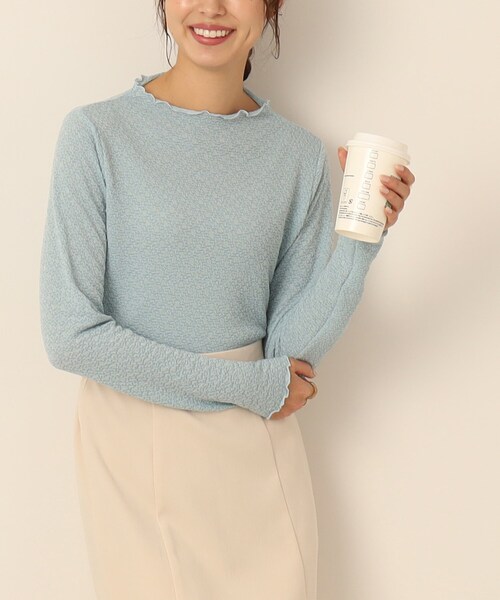 【デザイン】表面感のあるふくれジャカード素材を使用したインナー。プルオーバーや羽織もの、ジャンスカなどのインナーとしてコーデに大活躍してくれます。1枚でも様になるデザインで、衿ぐりや袖口、裾にメローをあしらい、フリルのような仕様がポイントです。ボトルネックで首元がきれいに見えるデザイン。【素材】ぽこぽことした表面感が特徴のふくれジャカード素材。伸縮性のあるジャージ素材なので、着心地も◎柔らかい肌触りにこだわった1枚です。※こちらの商品は透け感があります。#CutieBlonde#Cutie#cutieblonde#cutie#キューティブロンド#キューティ#20代#30代モデル情報:身長168cm B78 W58 H84 着用サイズ:02(M)店舗へのお問い合わせ商品番号:256-16004●製品寸法:01(S):着丈52cm B82cm 袖丈59cm 肩幅32cm02(M):着丈54cm B87cm 袖丈60cm 肩幅33cm03(L):着丈57cm B92cm 袖丈61cm 肩幅34cm備考: